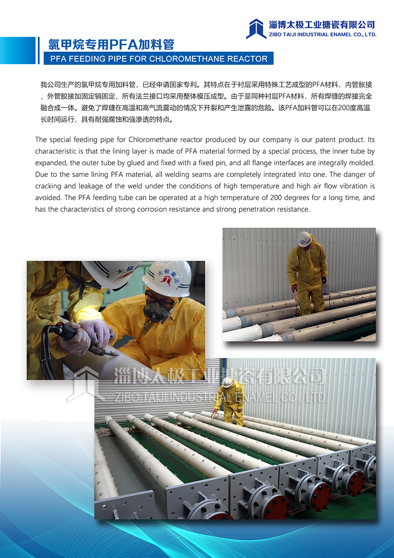 我公司生產(chǎn)的氯甲烷專用加料管,已經(jīng)申請國家專利。其特點在于襯層采用特殊工藝成型的PFA材料,內(nèi)管脹接,外管膠接加固定銷固定,所有法蘭接口均采用整體模壓成型。由于是同種襯層PFA材料,所有焊縫的焊接完全融合成一體。避免了焊縫在高溫和高氣流震動的情況下開裂和產(chǎn)生泄露的危險。該PFA加料管可以在200度高溫長時間運行,具有耐強腐蝕和強滲透的特點。